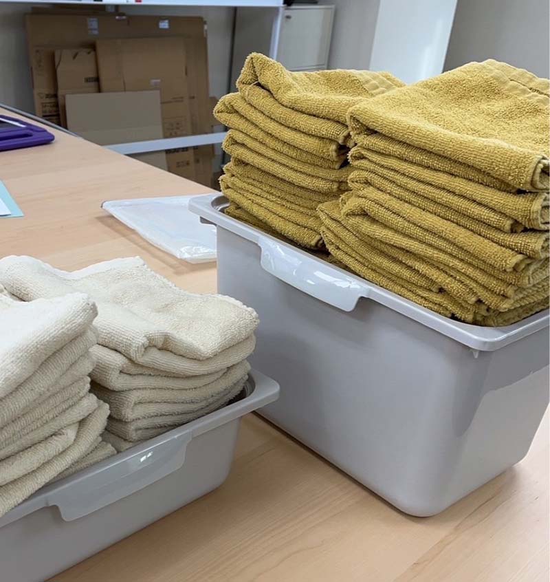 タオルたたみ・Tシャツたたみを行い、今後のボランティア活動に向けての練習を 行っています。