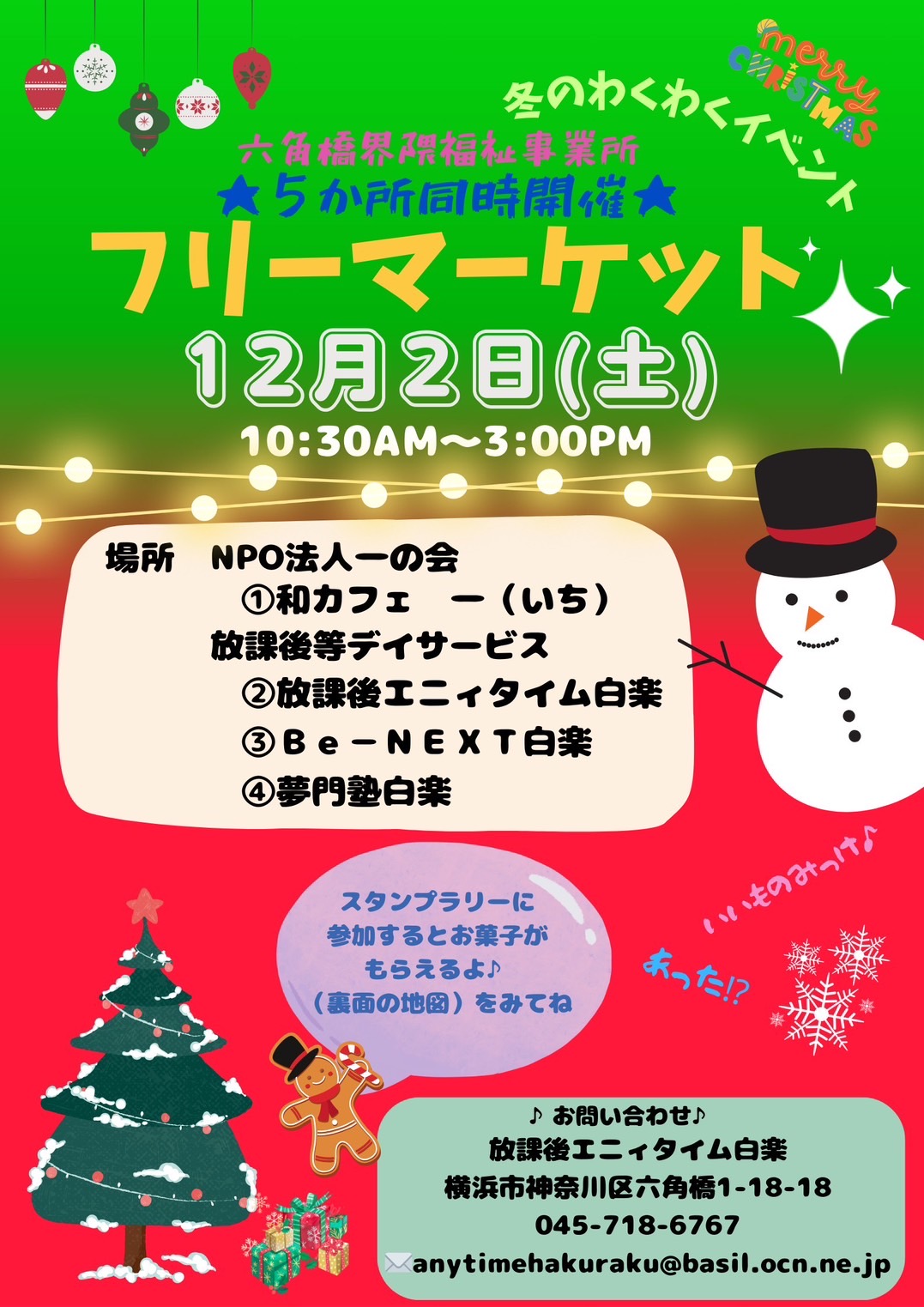 冬のわくわくイベントとして六角橋界隈福祉事業所が協力してフリーマーケットを行います!!開催時間12月2日(土)午前10:30~午後3:00開催場所NPO法人 一の会 和カフェ 一(いち)放課後エニィタイム... - 2023/04/24(月)
